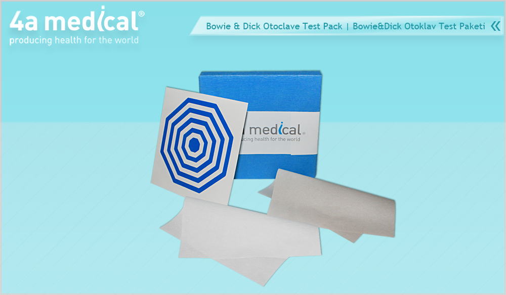 EN 285 Avrupa Standardında bahsedildiği üzere bir günlük buhar geçirgenlik testi her otoklavda yapılmalıdır. Bundan dolayı, 4A Bowie&Dick Tip Otoklav Test Paketini geliştirmiştir. İndikatör sayfası açık maviden koyu renge dönerek test sonucu garantiler ve temiz bir yorumlamaya müsade eder. Test paketi ISO 11140-1 (class 2 + 4), EN 867-4 ve ISO11140-4’e göre uygundur.